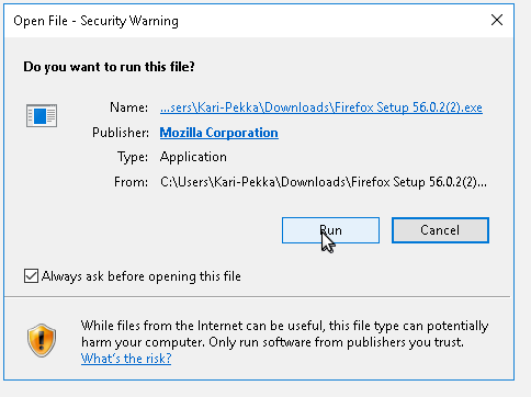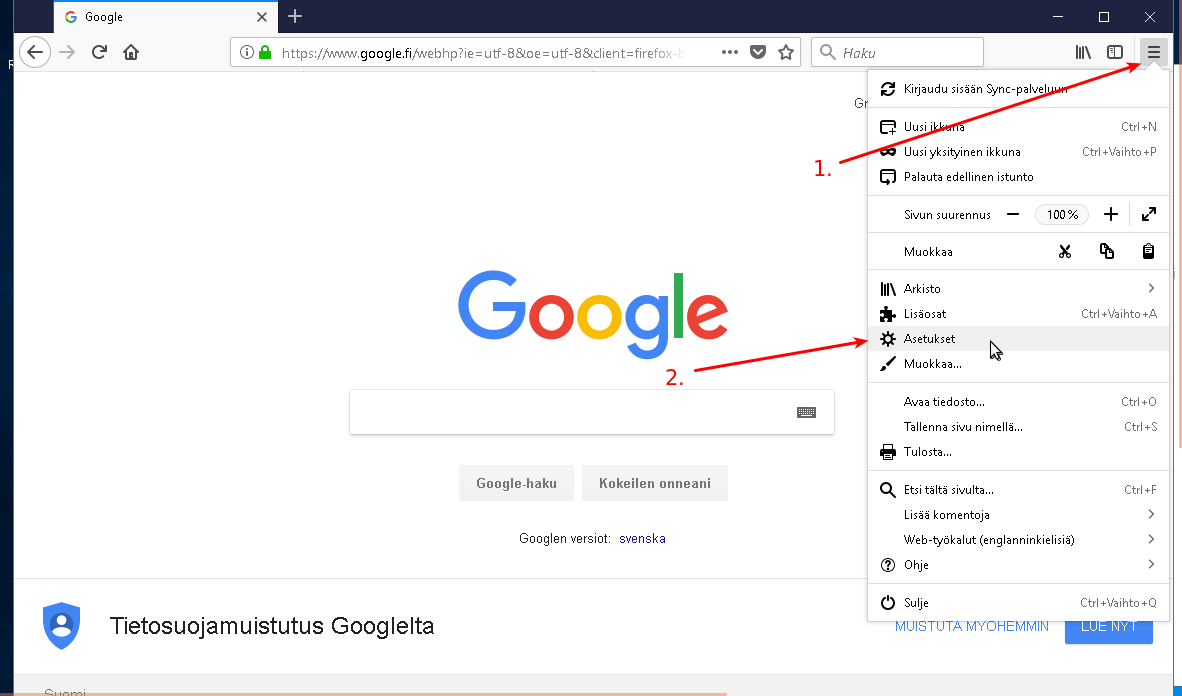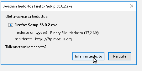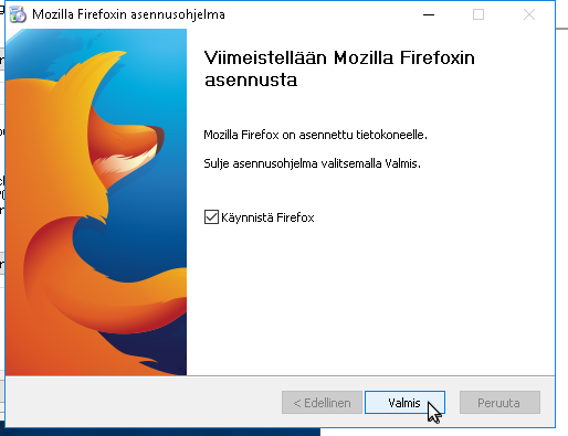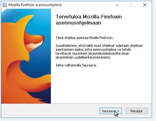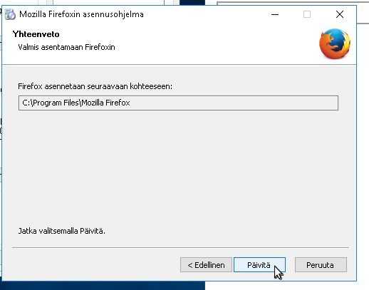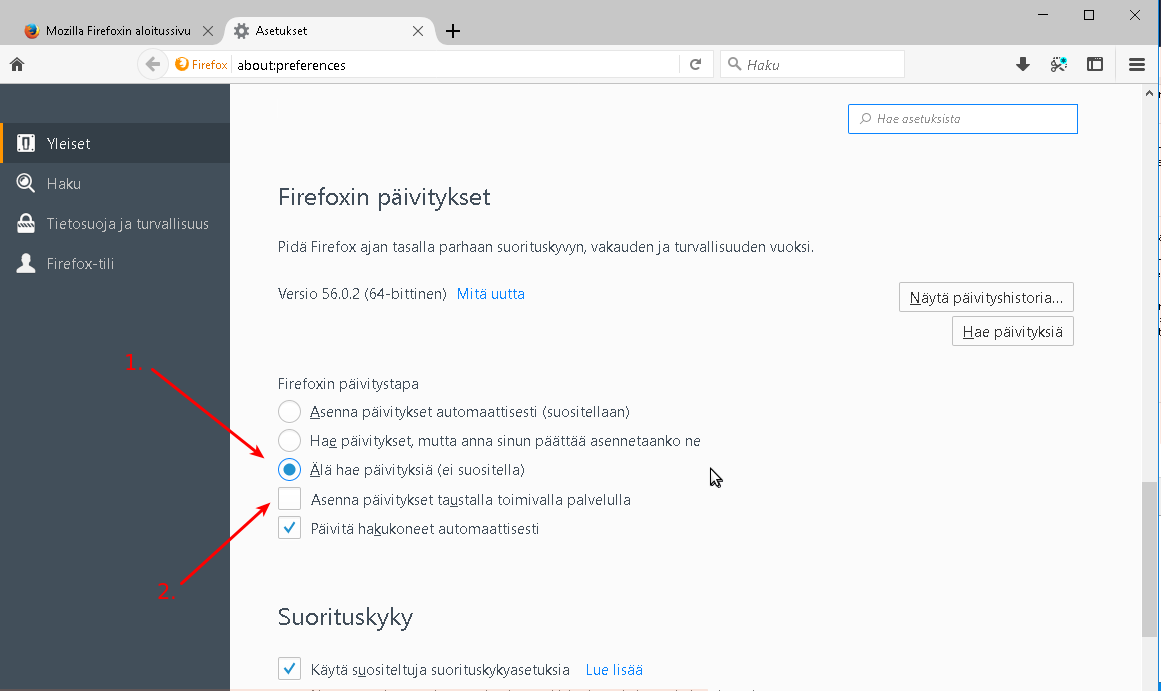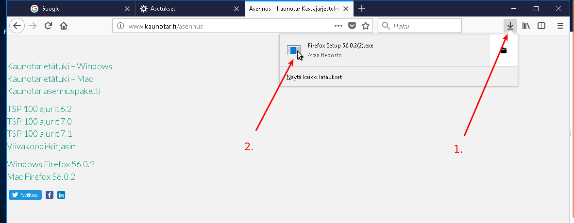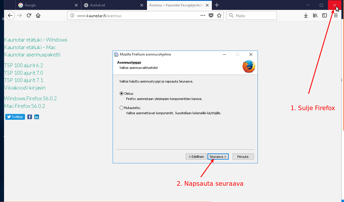 Firefox 57 versiossa kuitin tulostamisesta huolehtiva lisäosa ei toimi. Näiden ohjeiden avulla saat tietokoneeseesi vanhan toimiva version: Estä Firefoxia päivittymästä uudelleen: Avaa asetukset Rullaa alaspäin ja valitse ”Älä hae päivityksiä” ja ota pois päältä ”Asenna päivitykset taustalla toimivalla palvelulla” Päivitä Firefox vanhempaan versioon, mikäli kuitin tulostus ei toimi oikein Klikkaa ja lataa ensin tästä tietokoneesi mukaan joko Windows versio tai Mac versio ja tallenna tiedosto: Avaa tiedosto Suorita tiedosto Hyväksy muutokset Jatka Firefoxin asennusta Sulje Firefox selain (alla olevassa kuvassa kohta 1) ennen asennustyypin valintaa (kohta 2). Valitse Päivitä Valitse Valmis Valmista tuli. Ilmoittelemme myöhemmin, kun Firefoxista tulee ulos versio, jolla tulostaminen jälleen onnistuu.