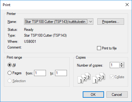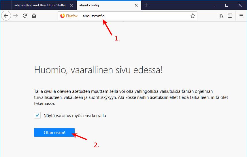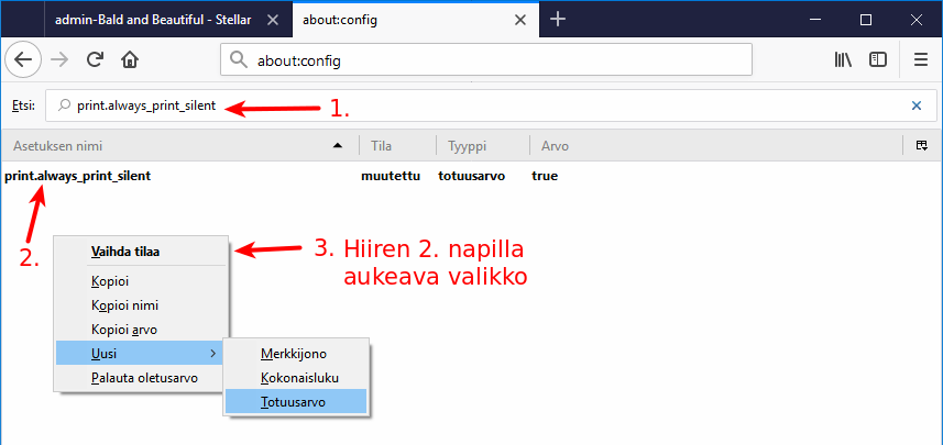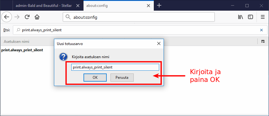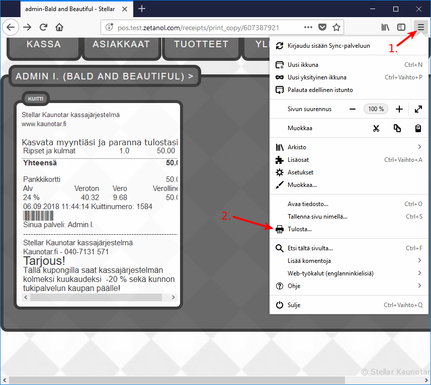 Jos kuittitulostin tulostaa liian pitkää kuittia, saat korjattua sen näin. Mikäli tämän ohjeen kanssa tulee hankaluuksia tai asiat eivät tunnu onnistuvan, niin ottakaa yhteyttä kassan ylläpitosivulta löytyviin puhelinnumeroihin, niin katsotaan yhdessä asetukset kuntoon. Hae kuittitapahtumista jokin kuittikopio. Avaa tulostusasetukset avaamalla valikko (1.) ja klikkaamalla ”Tulosta” (2.) Varmista, että kooksi on valittu ”sovita” (Kohta 1.) Klikkaa ”Sivun asetukset” (Kohta 2.) jolloin sinulle aukeaa sivun asetukset. Klikkaa ”Sivun asetuksista” ”Marginaalit ja Ylä- /alatunnisteet” (Kohta 3.) Aseta kaikkien neljän marginaalin kooksi 0 (nolla), sekä valitse kaikkiin kuuteen ylä- ja alatunnisteluokkaan ”tyhjä” (Kohta 4.) Paina OK (Kohta 5.) Klikkaa ”Tulosta…” (Kohta 6) Testaa, että kuitti tulostuu oikein klikkaamalla tulostusdialogista ”OK” Jos kuitti tulostuu oikein, sulje esikatselu klikkaamalla ”Sulje” Mikäli sinulle sopii kuitin tulostuksen yhteydessä hyväksyminen ”OK” nappia painamalla, voit jättää ohjeen seuraamisen tähän. Jos haluat, että kuitti tulostetaan suoraan ilman tämän tulostusdialogin näyttämistä, jatka eteenpäin. Huomaa kuitenkin, jos päätät jatkossa hypätä tulostusdialogin yli, dialogi hypätään yli jokaisen tulostuksen kohdalla. Tulostusdialogin yli hyppäämistä ei voi valitettavasti enää teknisistä syistä johtuen tehdä pelkästään kassan kuitin tulostuksessa. Tulostusdialogin yli hyppääminen Kirjoita osoiteriville about:config ja paina enter (Kohta 1.) Klikkaa ”Otan riskin!” -painiketta (Kohta 2.) Sinulle aukeaa pitkä sivullinen erilaisia selaimen asetuksia. Ole huolellinen ja varovainen seuraavissa vaiheissa! Kirjoita ”Etsi:” -riville ”print.always_print_silent” (Kohta 1.) Tarkista, näkyykö kohdassa 2. asetusta. Jos asetusta ei näy, avaa hiiren 2. napilla klikkaamalla valikko (Kohta 3.) Valitse ”Uusi” -> ”Totuusarvo” Kirjoita asetuken nimi ”print.always_print_silent” kuten kuvassa. Paina OK. Näet ”kirjoita totuusarvo” laatikon. Valitse ”true” ja paina OK, jolloin ikkuna sulkeutuu. Varmista, että asetuksen ”Arvo” on ”true”, kuten ylemmässä ikkunassa näkyy. Valmista tuli! Nyt voit testata kuitin tulostusta automaattisesti ottamalla kuittikopion Voit peruuttaa automaattisen tulostuksen hakemalla uudestaan ”about:config” sivulta ”print.always_print_silent” muuttujan, ja tuplaklikkaamalla riviä, arvoksi vaihtuu ”false”. Mikäli tämän ohjeen kanssa tulee hankaluuksia tai asiat eivät tunnu onnistuvan, niin ottakaa yhteyttä Kassan ylläpitosivulta löytyviin puhelinnumeroihin, niin katsotaan yhdessä tulostinasetukset kuntoon.