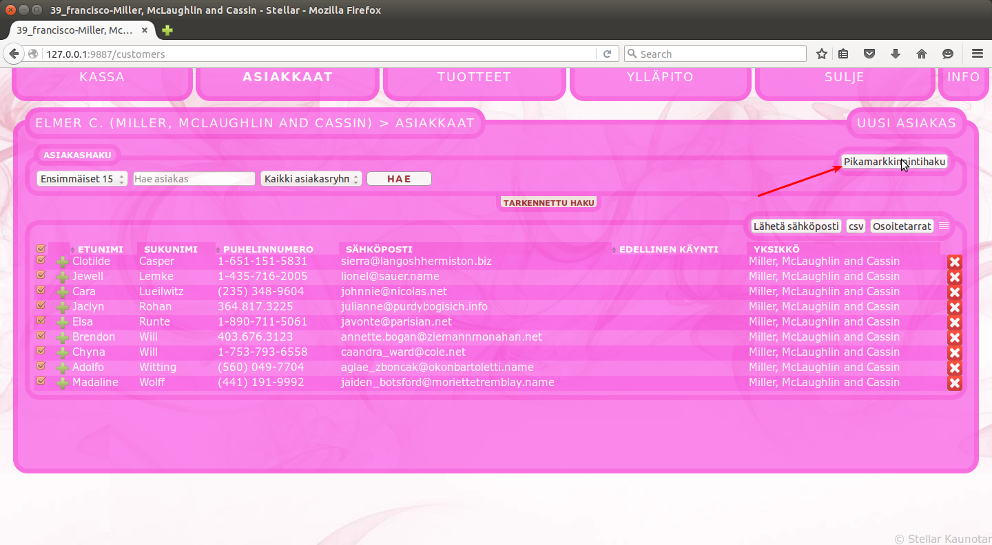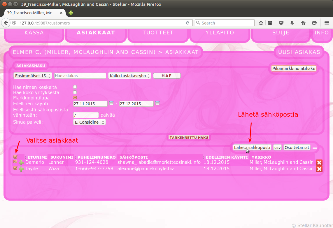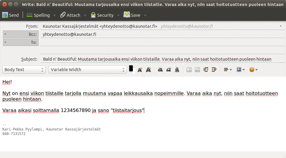 Ehkä sinulla on joskus varauskalenterissasi tyhjää tilaa. Pikamarkkinointityökalulla täytät kalenterisi vapaat ajat kutsumalla asiakkaitasi käymään uudelleen. Pikamarkkinointityökalulla löydät helposti asiakkaasi, joiden edellisestä käynnistä on kulunut sopiva aika. Lähettämäsi tarjouksen perusteella saatat hyvinkin saada tyhjän tilan täytettyä. Näin käytät pikamarkkinointia: Mene ”asiakkaat” – välilehdelle ja klikkaa pikamarkkinointi -painiketta.Oletuksena työkalu löytää ne asiakkaasi, jotka ovat käyneet viimeksi 1 – 2 kuukautta sitten. Pikamarkkinointihaku rajaa automaattisesti pois ne, jotka ovat kieltäneet markkinoinnin tai joille olet lähettänyt sähköpostia viimeisen seitsemän päivän aikana. Näitä rajauksia ja muita valintoja voit muuttaa sivulle aukeavasta tarkennetun haun laatikosta ja tehdä uuden haun painamalla ”hae” painiketta. Valitse ne asiakkaat, joille haluat lähettää postia ja paina ”Lähetä sähköposti” Tietokone avaa sähköpostiohjelmaasi uuden sähköpostin, mikä on osoitettu valitsemillesi henkilöille. Voit nyt kirjoittaa ja lähettää haluamasi viestin.