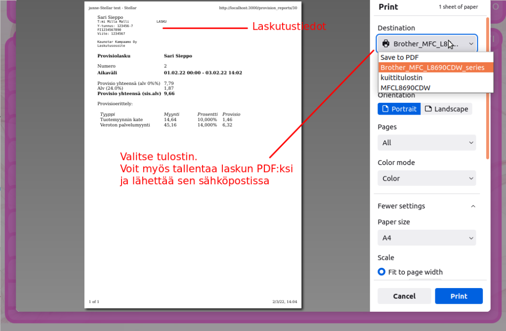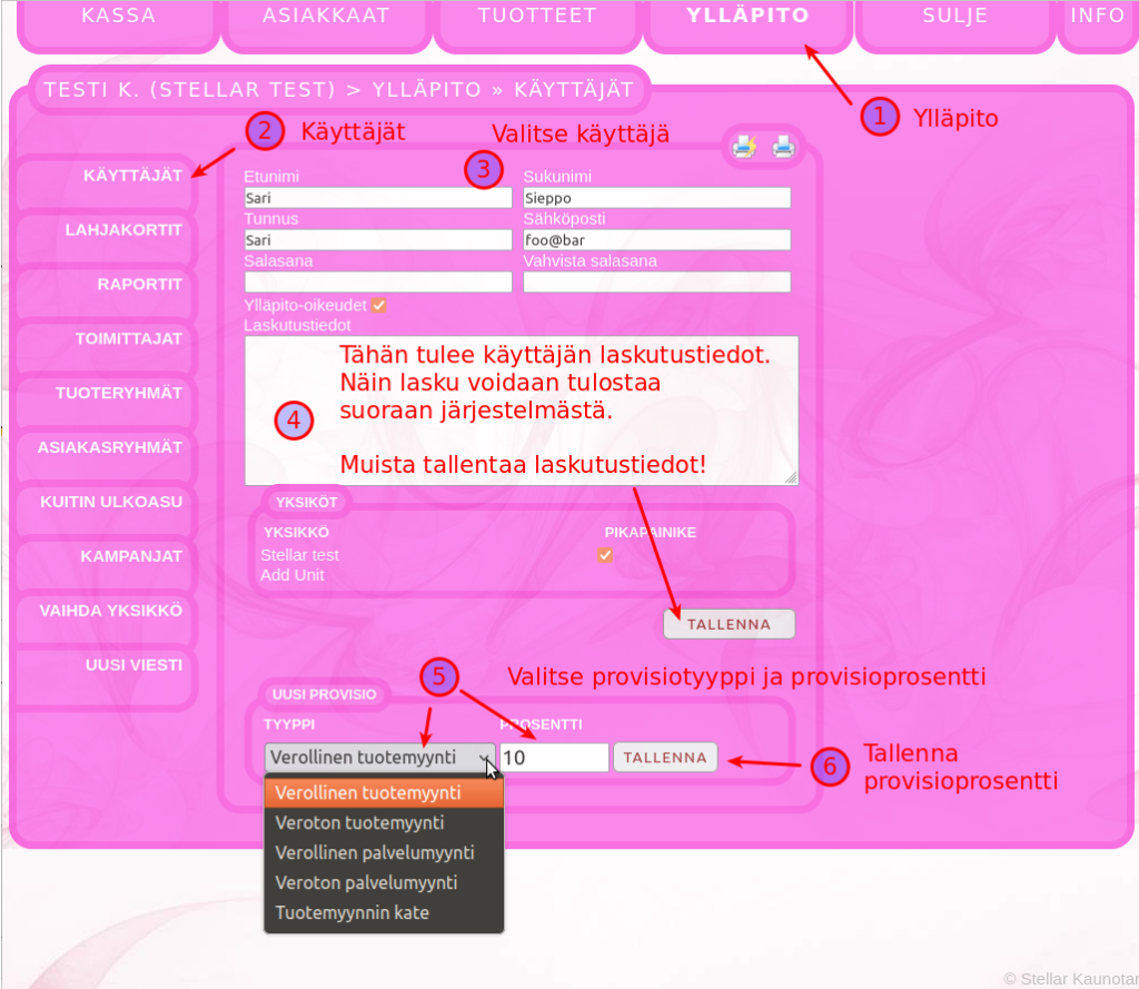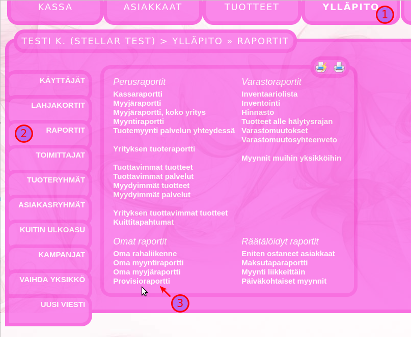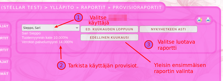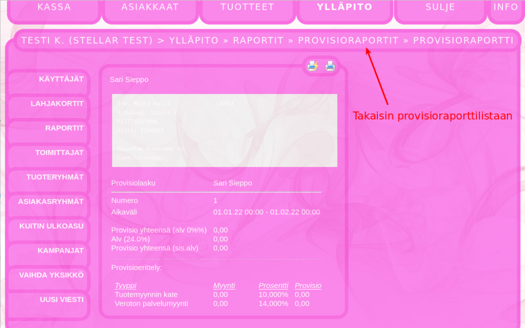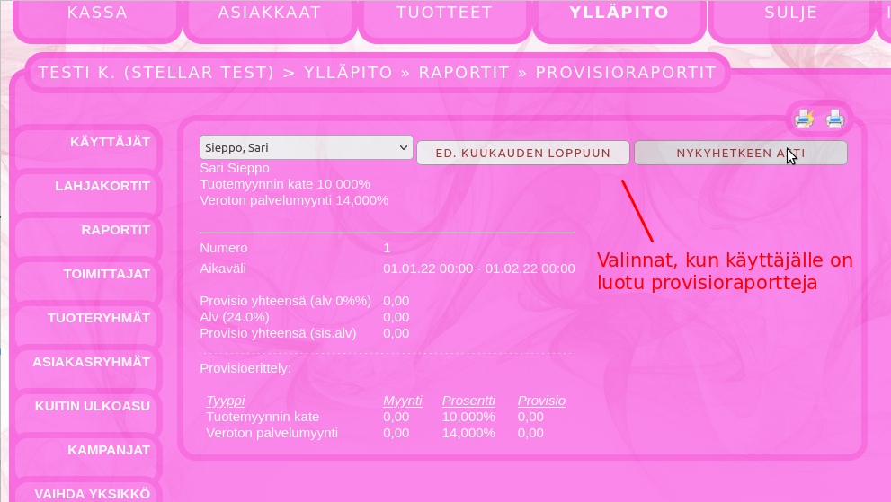 Sopimusyrittäjien laskutus hoituu kätevästi provisioraporttityökalulla. Tässä selostetaan, miten provisioraporttia käytetään. Provisioprosenttien asettaminen: Mene ylläpito -> käyttäjät ja valitse käyttäjä.Tarkista käyttäjän laskutustiedot ja tallenna tarvittaessaValitse provision tyyppi ja provisioprosentti ja tallennaVoit lisätä useita provisiotyyppejäverollinen myynti laskee provision verollisesta myynnistäveroton myynti laskee provision verottomasta myynnistätuotemyynnin kate laskee provision tuotemyynnin katteesta Alla esimerkki, miltä täytetyt provisiotiedot voivat näyttää: Provisioraportteihin pääsee seuraavasti: Mene ylläpito -> Raportit -> Provisioraportit Provisioraportin luonti käyttäjälle: Valitse käyttäjä, jolle raportti luodaanTarkista käyttäjän provisioprosentitValitse luotava raporttiEnsimmäinen raportti voidaan luoda edelliselle kuukaudelle. Kun ensimmäinen provisioraportti on luotu, seuraavat luodaan aina edellisen raportin lopusta, jolloin kaikki käyttäjän tekemät myynnit tulevat raportoitua. Varmista provisioraportin luonti: Takaisin provisiolistaan pääse klikkaamalla ”provisioraportit”. Jos jaksolla ei ole myyntejä, raportti näyttää nollaa. Kun yksi provisioraportti on luotu, voit luoda seuraavat raportit edellisen kuun loppuun tai nykyhetkeen. Uutta raporttia ei voi luoda nykyhetkeen, jos edellisen raportin luonnista on kulunut liian vähän aikaa. Provisioraportin tulostus. Pääset näkemään provisioraportin raportin luomisen jälkeen tai klikkaamalla provisioraporttilistassa olevaa raporttia Valitse, mihin haluat raportin tulostaa. Voit myös valita PDF vaihtoehdon, jolloin voit lähettää provisioraportin PDF muodossa ja mikäli laskutustiedot on kirjoitettu oikein, useat järjestelmät tunnistavat tässä muodossa tulostetun/lähetetyn raportin laskuksi. Takaisin provisioraporttilistaan pääset klikkaamalla ”provisioraportit”.