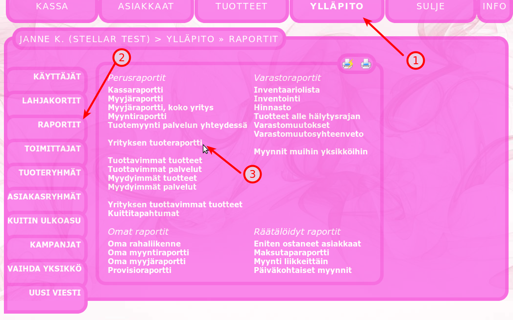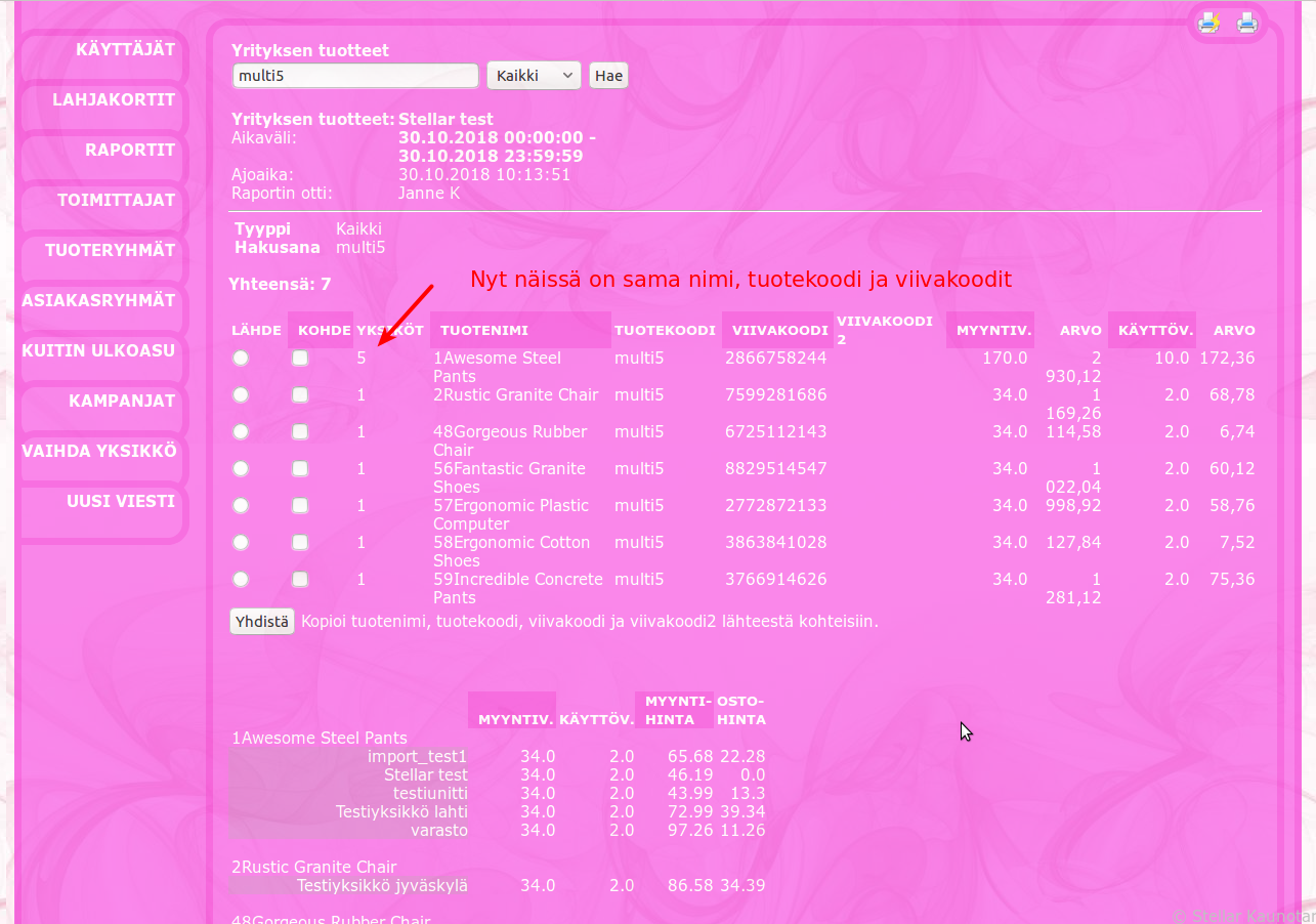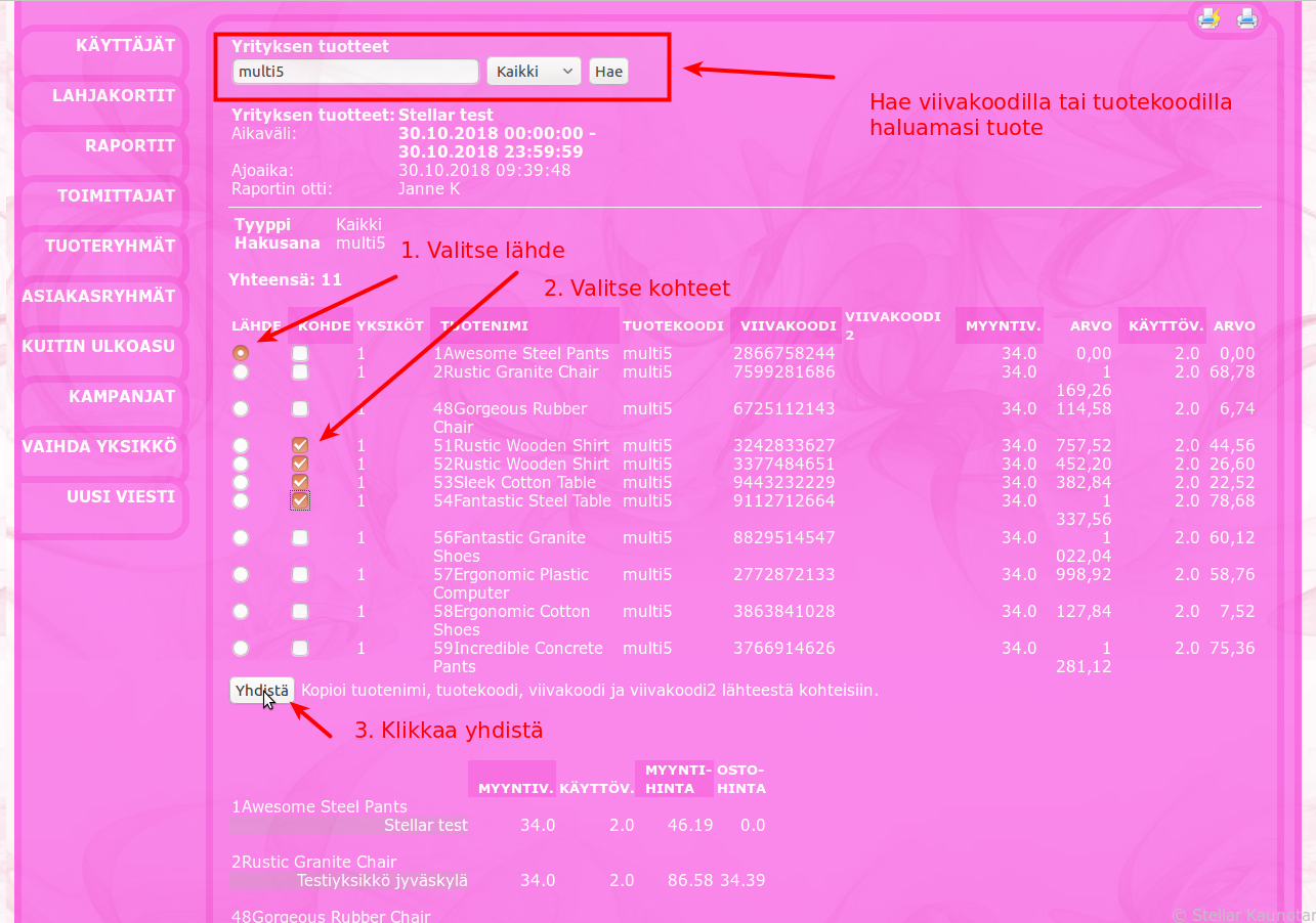 Näin saat yhtenäistettyä tuotetietokantoja. Mene ”Ylläpito -> Raportit -> Yrityksen tuoteraportti Hae haluamasi tuote viivakoodilla tai tuotekoodilla. Näet listassa tuotteen eri versiot eri yksiköissä. Valitse, minkä tuotteen nimi, viivakoodit ja tuotekoodit kopioidaan (lähde) ja mihin tuotteisiin ne kopioidaan (kohteet). Klikkaa ”yhdistä” Näet uudessa listassa yhdistämisen tulokset.