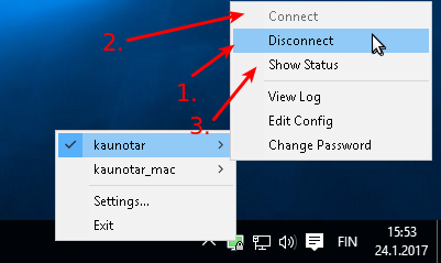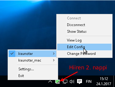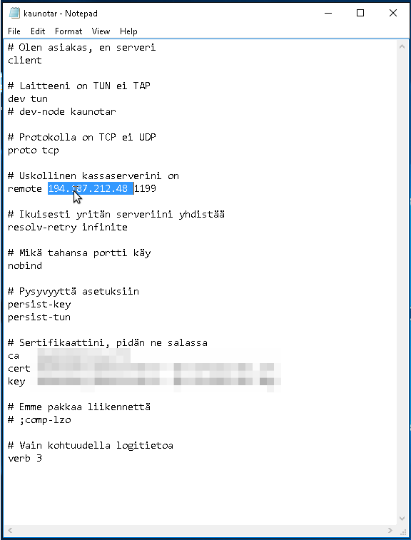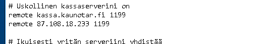 Kassajärjestelmän palvelimien verkko-osoite muuttuu. Tässä yksinkertainen ohje, miten päivität salatun yhteyden (openvpn) asetukset. Avaa salatun yhteyden asetukset: Edit Config tai Muokkaa asetuksia. Eteesi aukeaa asetustiedosto. Näet alla olevassa kuvassa rivin, joka asettaa kassapalvelimen osoitteen: remote 194.187.212.48 1199 Mikäli et löydä riviä, asetuksesi on jo päivitetty. Kohta 3 kertoo sinulle oikeat asetukset. Korvaa vanha palvelinasetusrivi rivi seuraavilla kahdella asetusrivillä, kuten alla olevassa kuvassa: remote kassa.kaunotar.fi 1199 remote 87.108.18.233 1199 Tallenna ja sulje tiedosto Testaa uusi yhteys Valitse Disconnect (katkaise yhteys) Valitse Connect (yhdistä) Valitse Show Status (näytä tila) Näytölle aukeaa yhteyden tilatiedot. Jossain kohdassa tilatiedoissa lukee uuden kassapalvelimen osoite 87.108.18.233 Uudemmissa salatun yhteyden ohjelmaversioissa osoite lukee viimeisellä rivillä. Onneksi olkoon, olet vaihtanut palvelinasetukset oikein! Kokeile kassan toiminta. Jos toiminnassa on jotain häiriötä, soita 040-7131572